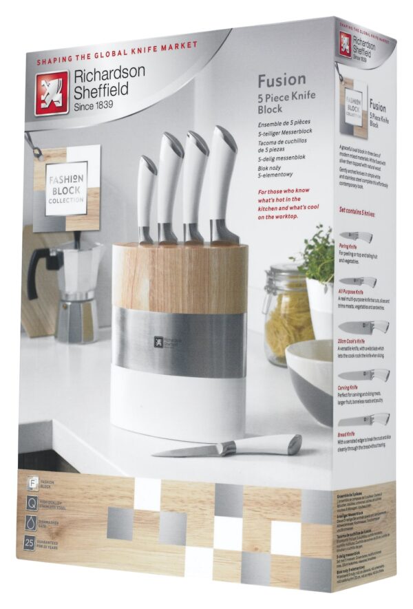 The sleek oval block takes its cues from soft curves of architecture and the trend for mixed materials to create our paired back Fusion Fashion Block. Merging together a modern mix of cool white, radiant silver and Scandi wood for modernism with a touch of warmth. Gently arched knives in simple white and stainless steel complete this effortlessly contemporary look.